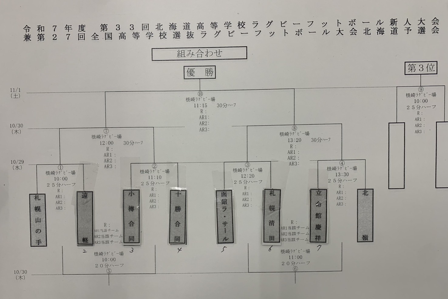 10月29日30日・11月1日に開催される「第33回北海道高等学校ラグビーフットボール新人大会 兼 第27回全国高等学校選抜ラグビーフットボール大会北海道予選会」(会場:函館根崎ラグビー場)の組み合せが決定しました。